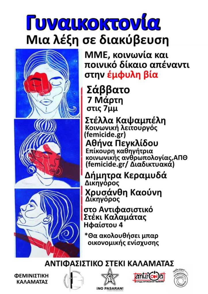 Στο πλαίσιο της καμπάνιας για την ανάδειξη της γυναικοκτονίας ως διακριτού εγκλήματος με κοινωνικές ρίζες και θεσμικές ευθύνες, διοργανώνουμε εκδήλωση – συζήτηση: